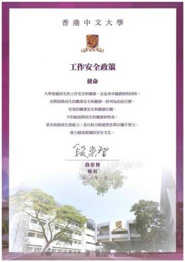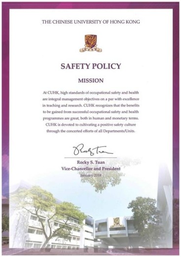 At CUHK, high standards of occupational safety and health are integral management objectives on a par with excellence in teaching and research. CUHK recognizes that the benefits to be gained from successful occupational safety and health programmes are great, both in human and monetary terms. CUHK is devoted to cultivating a positive safety culture through the concerted efforts of all Departments/Units.